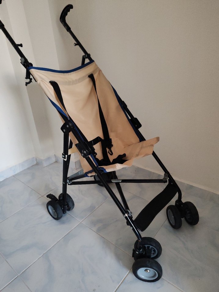 Hafif camel renginde, güvenli kemerli ve kolay hareket ettirilebilir tekerlekli bebek arabası.