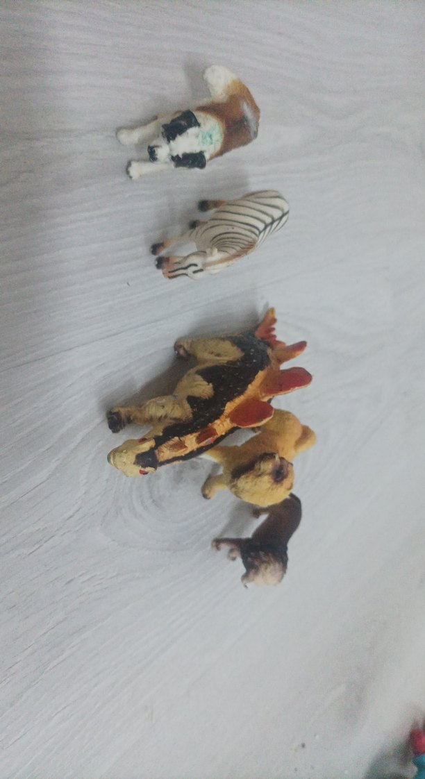 Hafif camel tonlarında, zebra ve diğer hayvan figürlerinden oluşan küçük oyuncak hayvan seti.