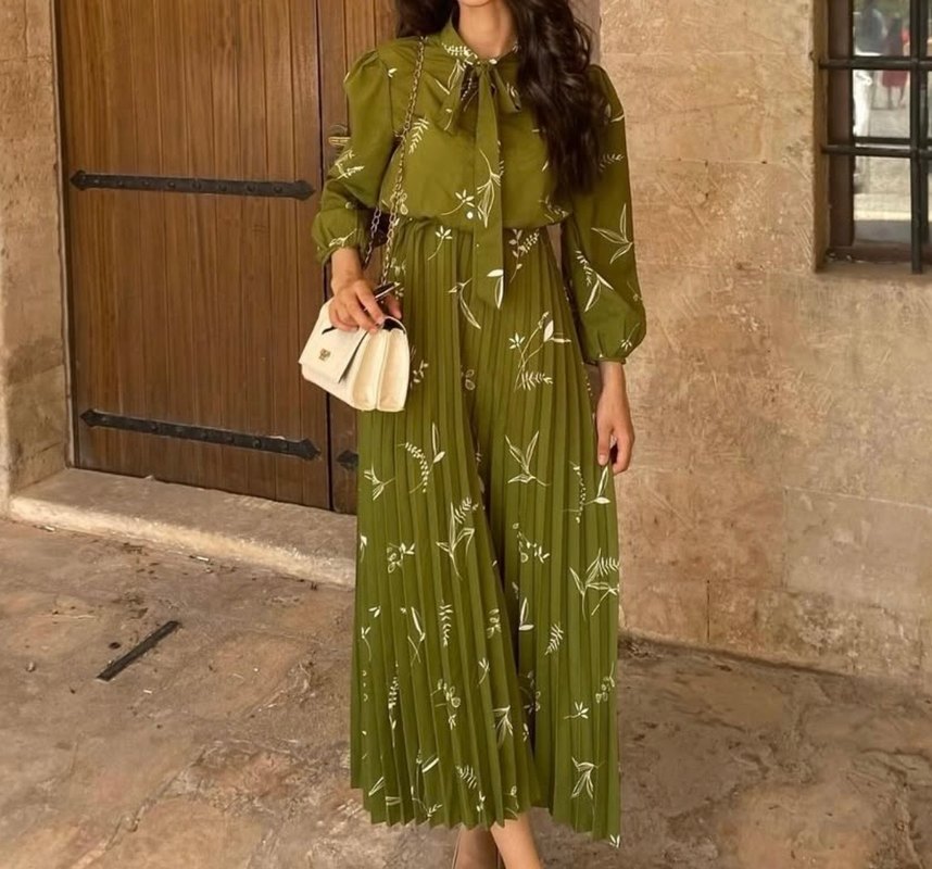 Haki renkte, pilili ve bol kesimli uzun elbise. Uzun kollu, straplez yakalı, sentetik kumaştan, Parisian bohem tarzında, hafif desenli. Günlük şık kullanım için uygun.