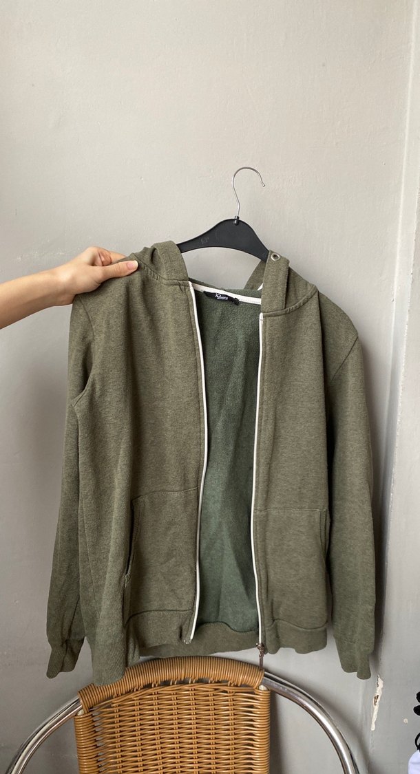 Hafif kalın kumaştan yapılmış, kapüşonlu ve fermuarlı, bol kesim haki yeşili ceket. Rahat günlük sokak stili için uygundur.