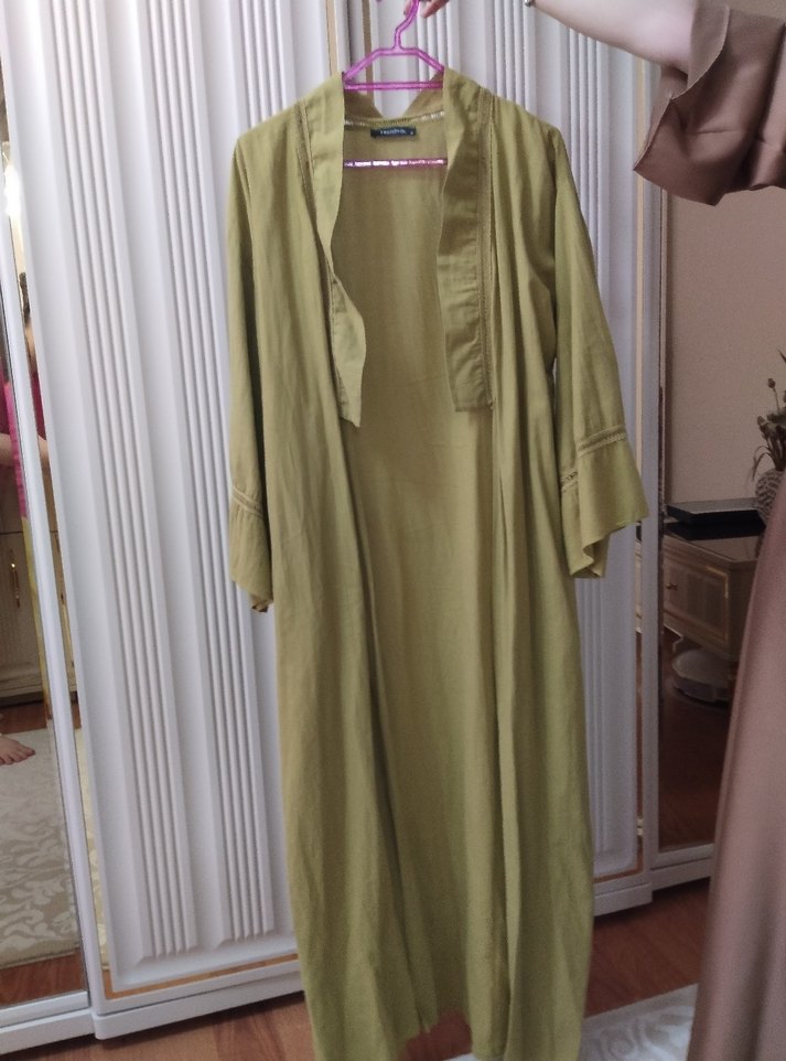 Uzun, hafif haki renkte keten kumaştan yapılmış, salaş kesimli ve uzun kollu. Drapeli tasarımı ve yaka detayı ile sade bohem tarzda.