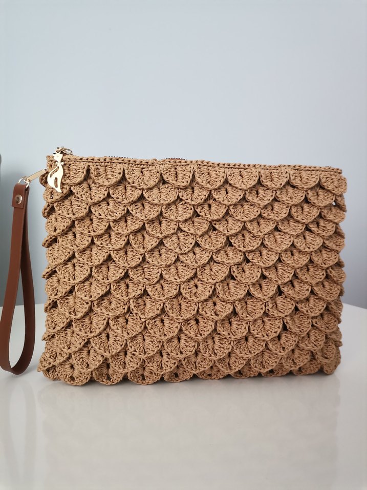 İçi astarlıdır. Fermuarlıdır. Hafif kahverengi örgü dokulu kadın portföy çanta, rahat ve bohem tarzı yansıtan desenli tasarım. Günlük kullanıma uygun, bilek askılı.