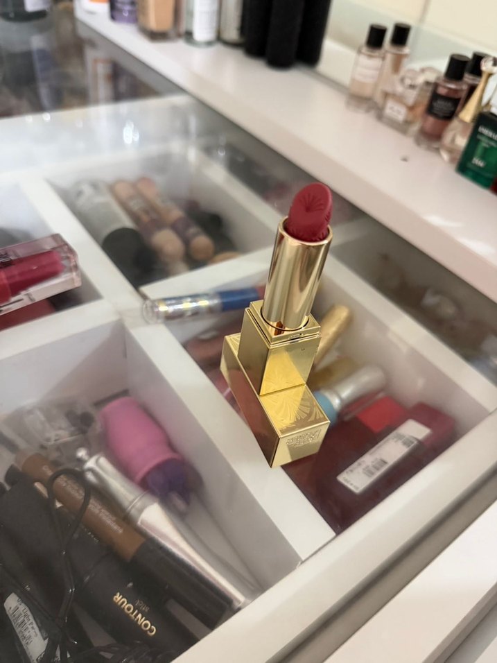 Hafif kırmızı tonunda, pürüzsüz dokulu, şık altın kaplamalı ruj.