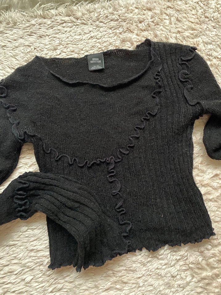 Vücuda oturan siyah triko kazak, uzun kollu ve kayık yaka. Rahat goth tarzı ve ince fırfır detayları ile günlük kullanıma uygun. Urban marka 1 kez giydim.Hafif transparandır