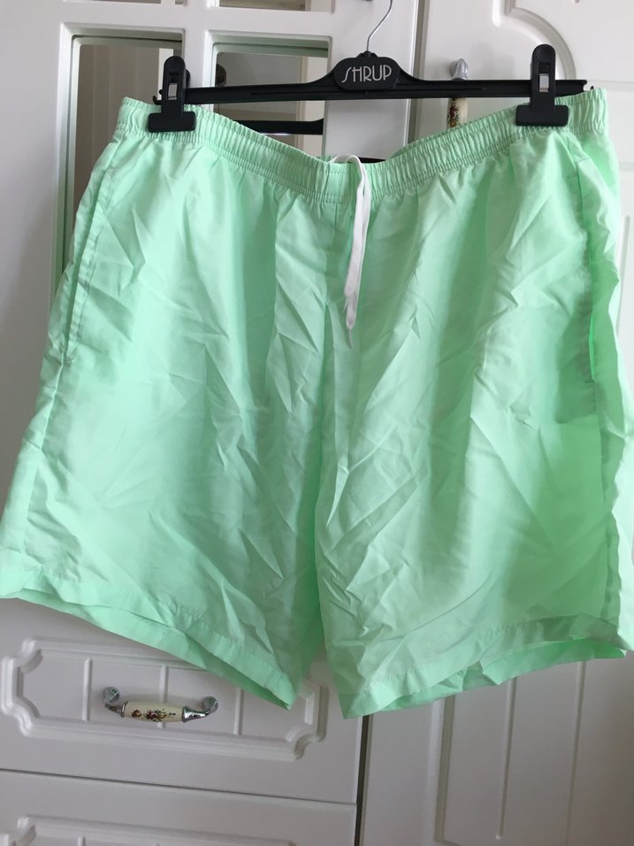 Pastel yeşil, bol kesim mini erkek deniz şortu. Rahat lastikli bel ve bağcık ile plajda kullanıma uygun, sade sokak stili.