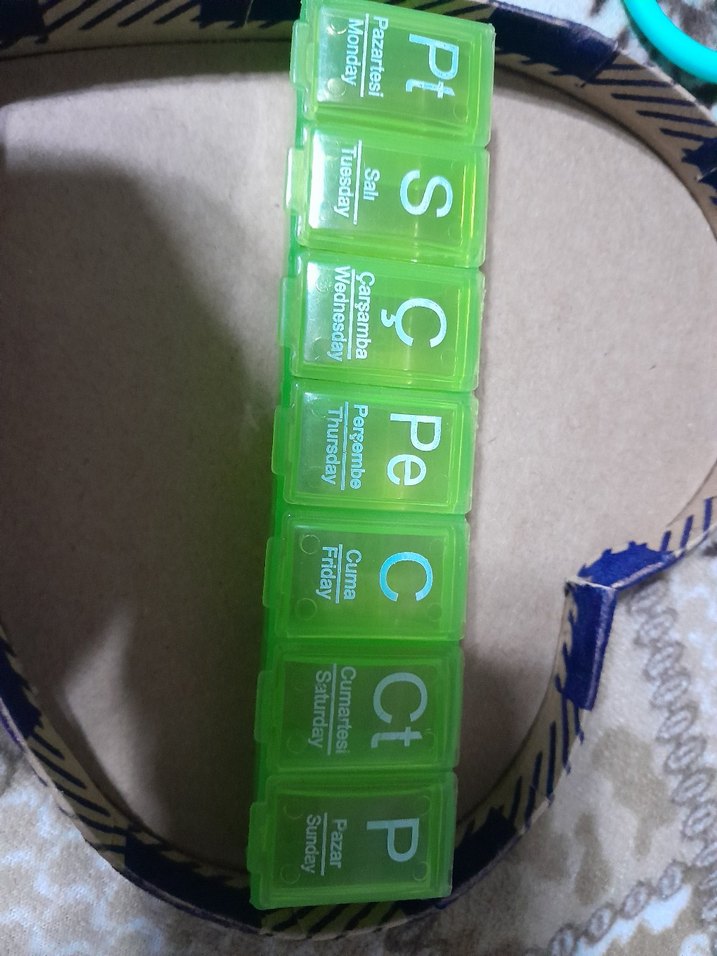 Her güne özel bölmeleri olan açık yeşil haftalık makyaj organizer kutusu. Kompakt ve kullanışlıdır. hap kutusu ama ben taki kutusu olarak da kullaniyorum benzerini