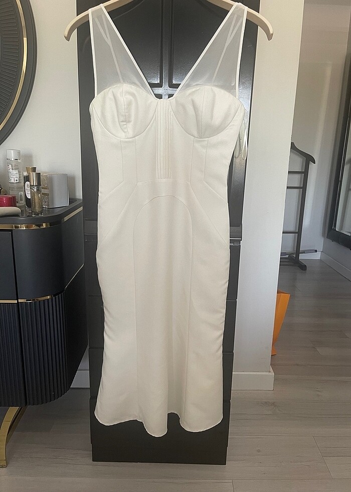 Şık,mat saten elbise. Giyilmiş olup. Herhangi bir sorunu yoktur.Kırık beyaz renktedir. 40 bedendir fakat kalıp biraz dardır.38 beden olarak düşünebilirsiniz. Boy omuzdan itibaren: 110 santim basen 44 santim