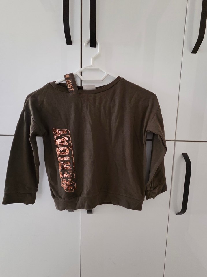 Uzun kollu, bisiklet yakalı, bol kesim kahverengi kız sweatshirtü. Baskılı desenli ve kemerli, sokak stiline uygun tekstil kumaşından.