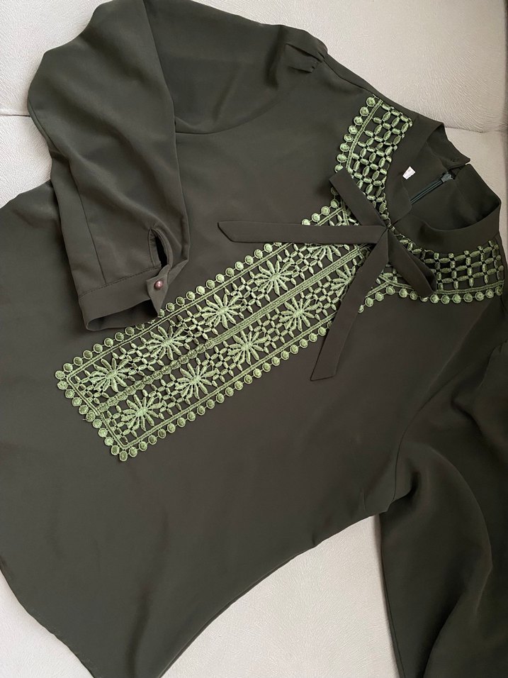 yüksek yakalı ve uzun kolludur. Ön kısmında nakış detayları ve manşetlerinde düğmeler bulunur. Sentetik kumaştan, uzun ve sade bir bohem tarzı sunar. Haki renginde bluz arkadan fermuarlıdır ve hiç kullanılmadı, bedeni olmadığı için satışta. Yaşadığım şehirde iyi bir tesettür mağazasından alındı kaliteli bir ürün, tertemiz.