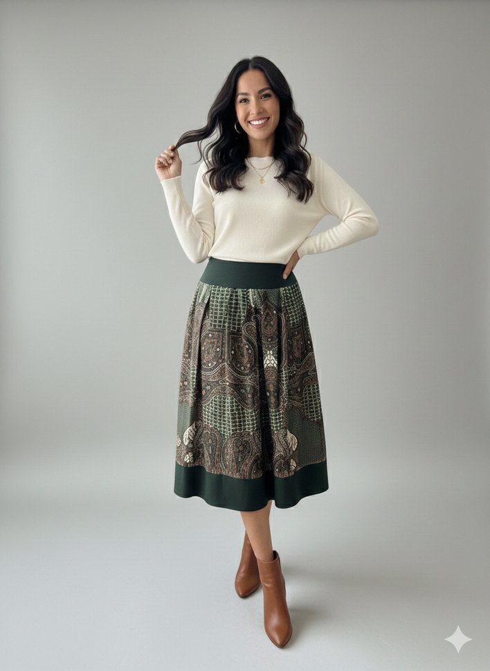 Haki renkli, hafif batik desenli, mevsimlik kumaşa sahip uzunluğu 86 cm astarlı bol kesim ve pileli bohem etek. Temiz ihtiyaç fazlası ürün