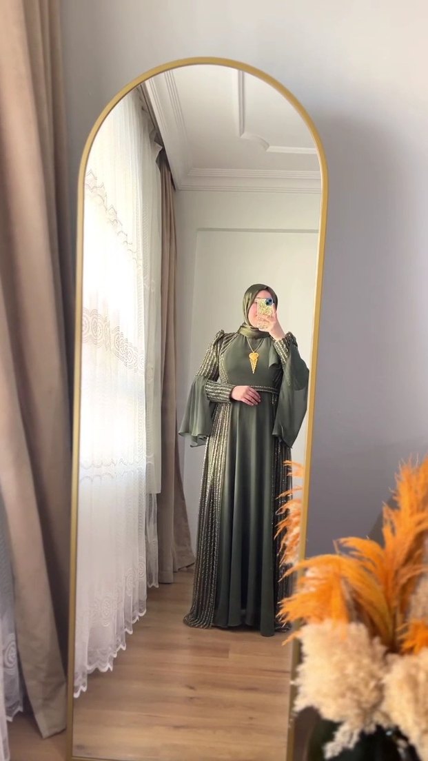 Yüksek yakalı, uzun kollu ve bol kesimli haki renkli bu uzun elbise, taşlı kumaşı ve drapeli detaylarıyla bohem ve gotik tarz sunar, düğünler için uygundur. abiye 50 bedendir ama dar kalip olduğu için 44 ve 46 bedene uyumludur iade kabul edilmemektedir ürün sorunsuzdur yenidir