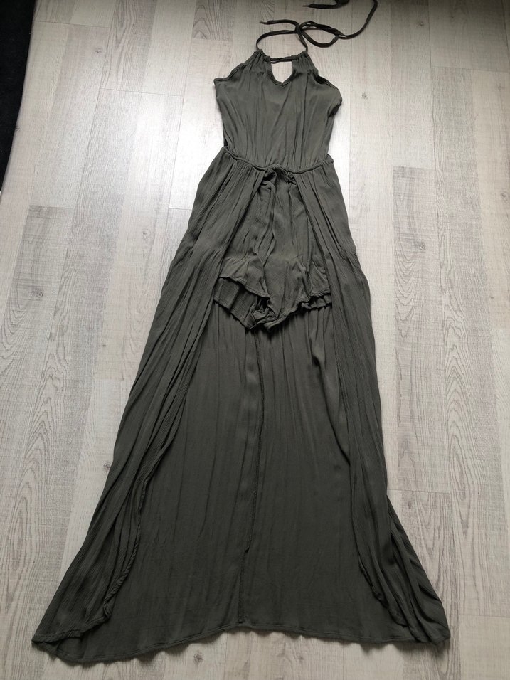 Haki renkli uzun elbise, drapeli ve bol kesimdir. İnce askılı ve V-yaka detaylı bohem tarzı, romantik akşamlar için uygundur. Mağazamızın tanıtım çekimlerinde kullanılmış ürünüdür.Sadece çekimler sırasında manken tarafından kullanıldığı için mağazada satışa konulmayarak yıkanıp burada satışa sunulmuştur.