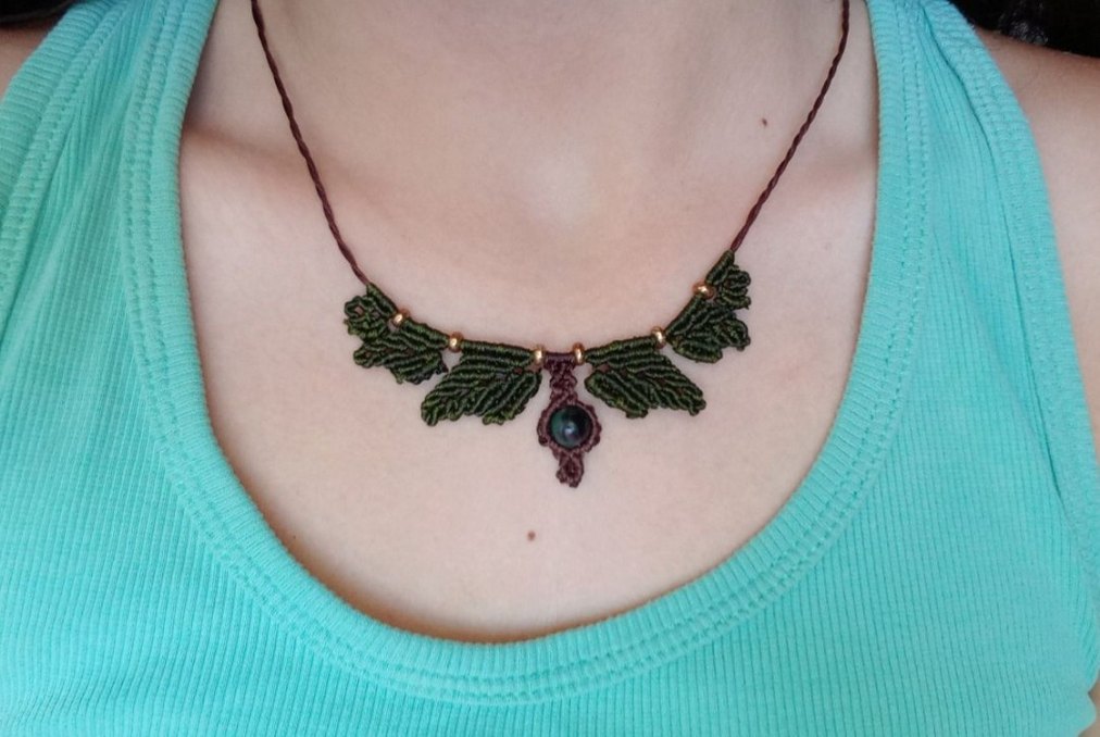 Haki boncuklu yaprak detaylı makrome choker kolye
