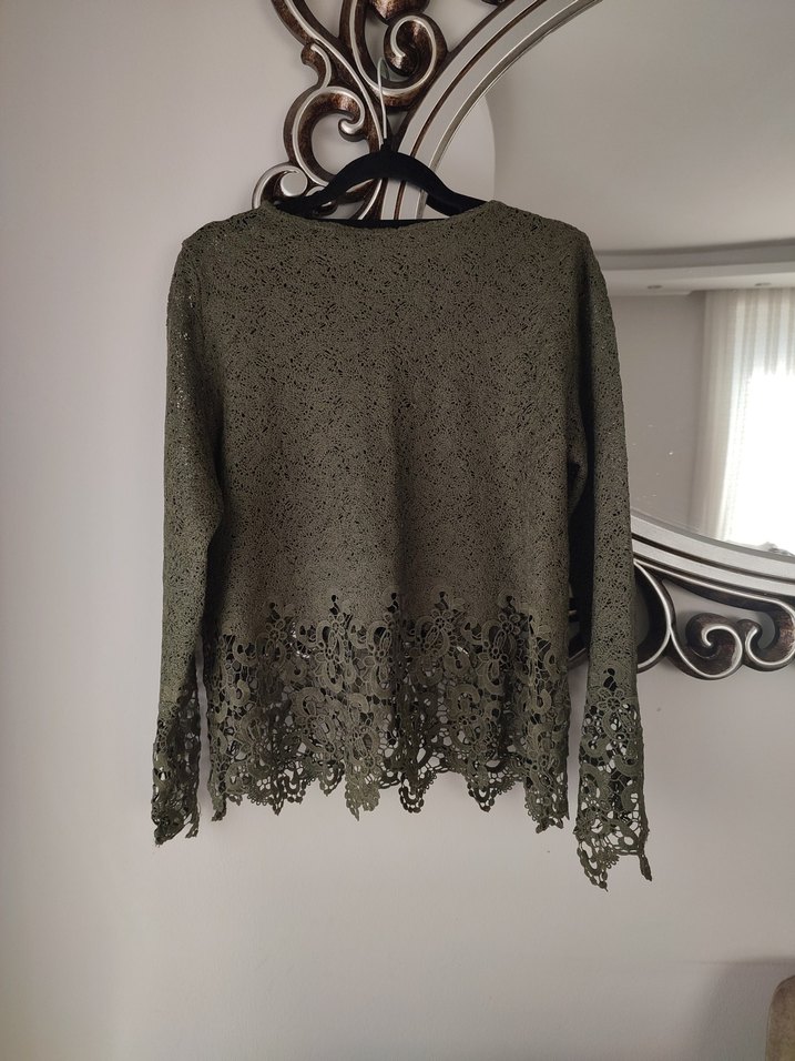 asker yeşili renkte, dantel işlemeli etek ve kol uçlarına sahip, uzun kollu, yuvarlak yaka, tam kesim kadın triko kazak. bohem tarzda, günlük kullanım için uygun. marka temsili