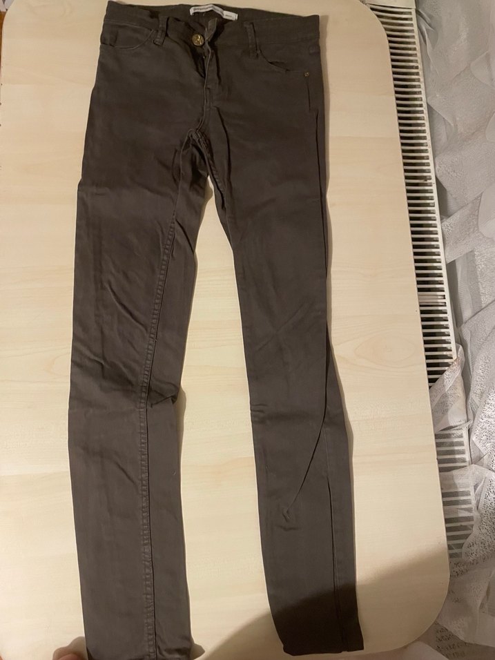Kahverengi, dar kesim kadın pantolon, normal boy ve yumuşak sentetik kumaştan, gündelik kullanıma uygundur ve düşük bellidir.