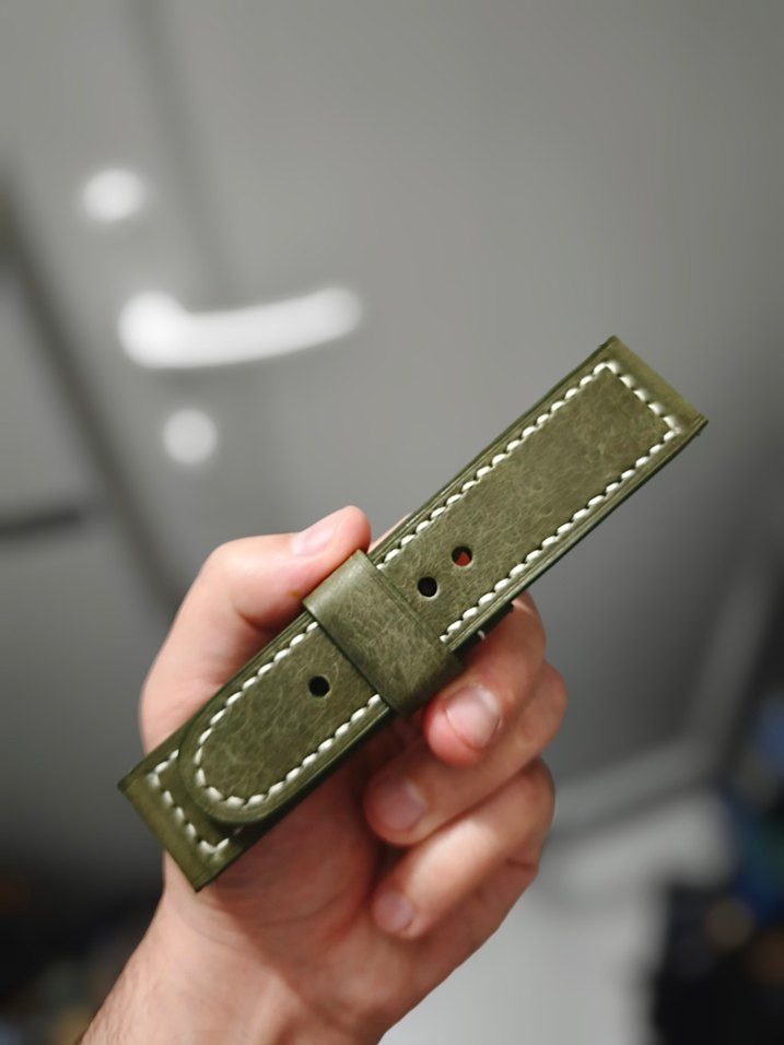 Beyaz dikiş detaylı haki deri erkek saat kayışı, minimalist biker tarzına uygun dayanıklı ve sade tasarım. ⌚