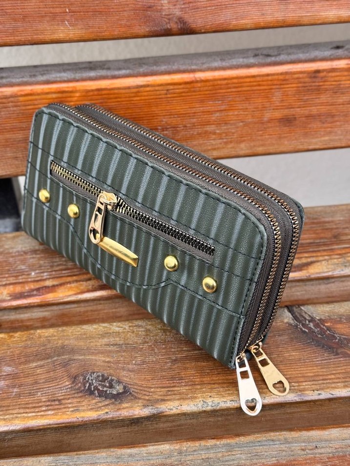Haki renkli deri, yılan desenli ve fermuarlı bölmeleri olan bohem tarzda kadın cüzdanı, günlük kullanım için uygundur. 34522