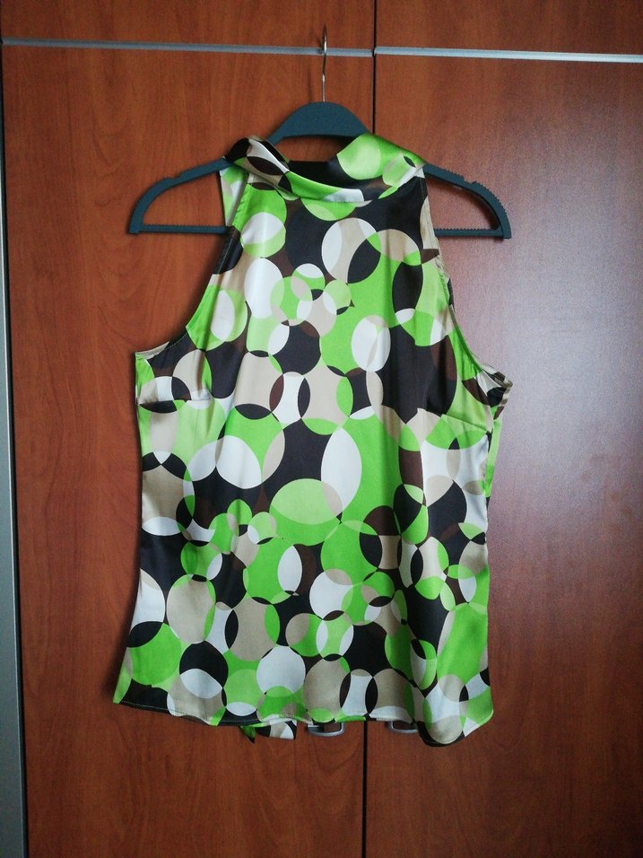 Haki tonlarında soyut desenli, yüksek yaka arkadan bağlamalı saten kumaştan kullanıma uygun şık ve fit tasarım.