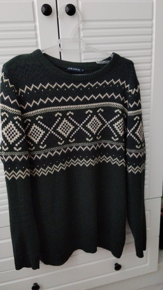 crew yaka ve uzun kollu, bol kesim triko kazak. Göğüs ve üst kollarda desenli detaylar bulunur, gündelik kullanıma uygundur.