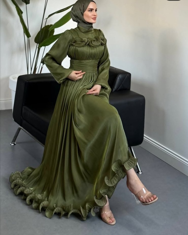 Haki Drapeli Uzun Abiye Elbise (şalı hediye)