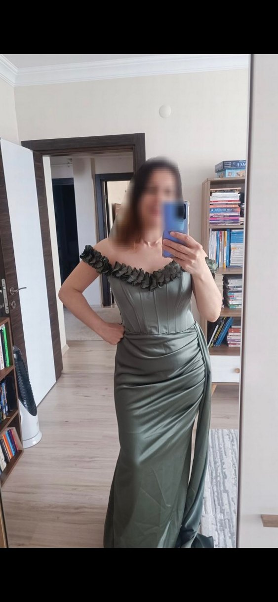 Sadece 4 saat giyildi. Yıkanmış temiz ürün. Fiyatta anlaşabiliriz. Drapeli, askısız ve uzun kesimli abiye , haki ve ipeksi kumaştan yapılmıştır. Düğünler için şık ve modern klasik tarzda, kolsuzdur. Düğün, kına, balo vs.