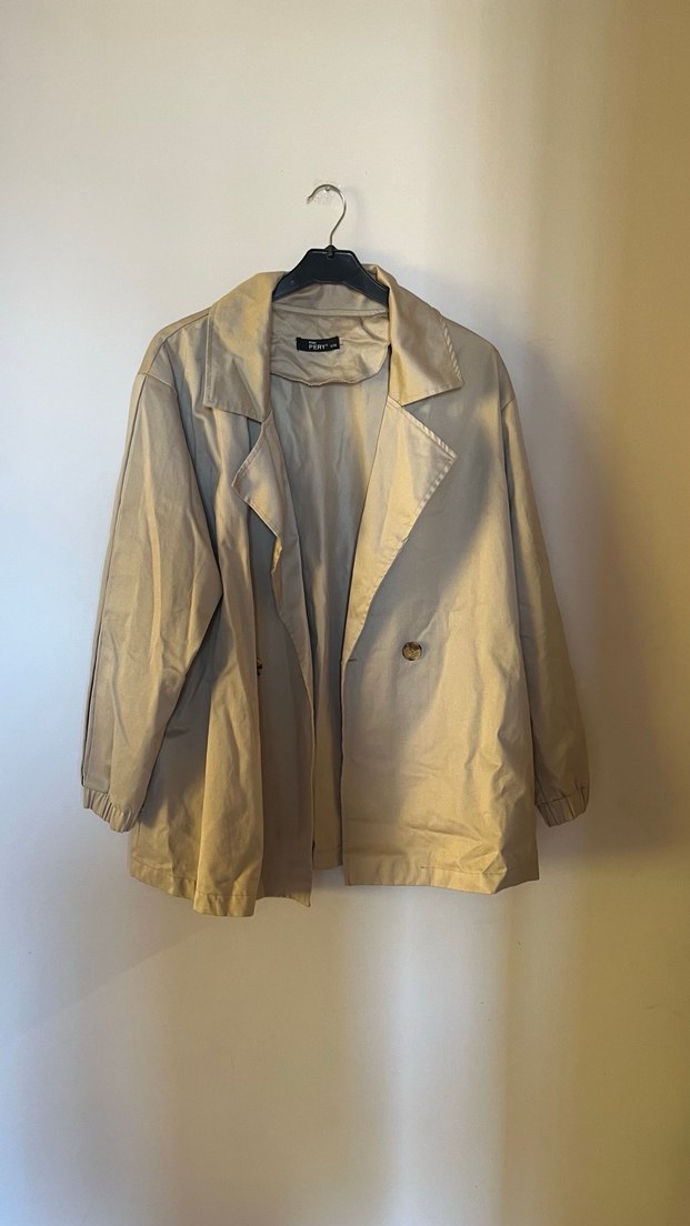 Haki renkli, düğmeli ve ceket yakalı, parlak bol kesim midi trençkot. Uzun kollu ve gündelik kullanıma uygun.