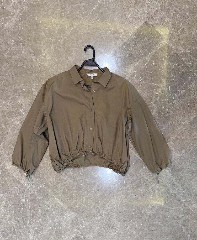 Haki renkli, düğmeli, uzun kollu ve yakalı kadın gömleği.