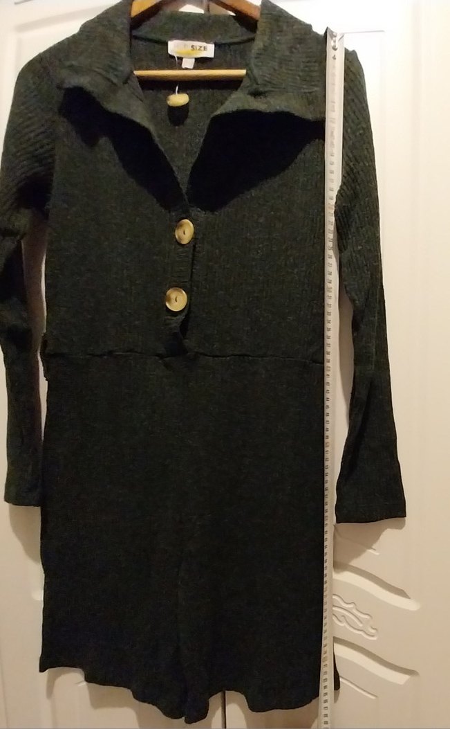 Düğmeli, Yünlü kumaştan Haki renkte tulum. vücuda oturuyor. Hediye geldi, üstümde duruşunu sevmediğim için hiç giymedim. 1. Ve 2.görseldeki renkler orjinale en yakını. Tam boy 85 cm, bel dikişinden ağa kadar uzunluk 30cm. Bel kısmındaki dikişe kadar üst beden uzunluk 39 cm. Paça genişliği 25 cm.