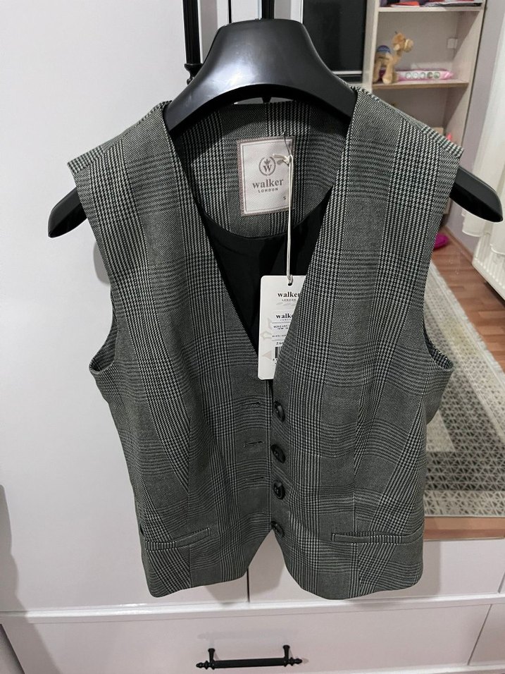 Düğmeli, haki renkli, kolsuz, baskılı desenli ve notched yaka detaylı midi uzunlukta kadın yelek. Rahat kesim ve günlük ofis kombinlerine uygundur.