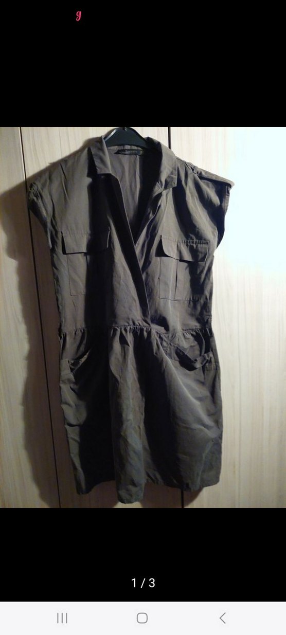 yakalı ve kolsuz haki elbise. bol kesim ve günlük sokak stili için uygundur.