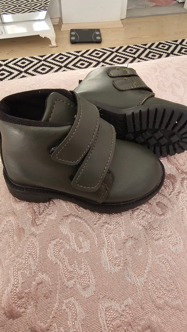 haki renkli, lastik malzemeden yapılmış, tokalı ve sade tasarımlı erkek çocuk botları.