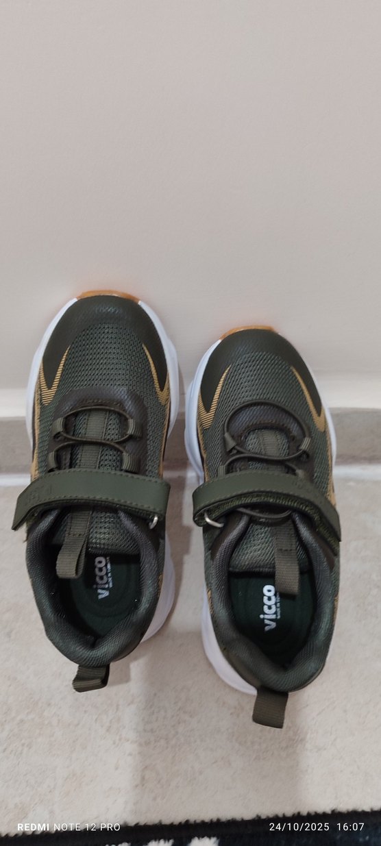 Haki renkli, yılan desenli erkek çocuk spor ayakkabısı. Velcro bantlı ve kauçuk tabanlı, rahat ve dayanıklı sokak stili ayakkabı.