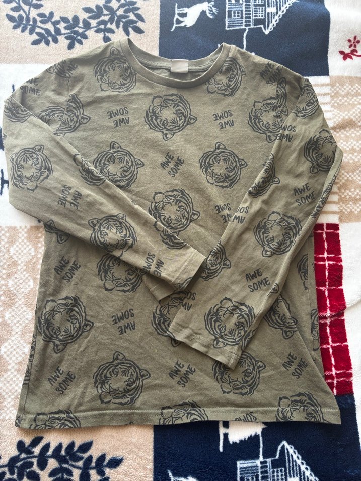 Haki E enkli, uzun kollu ve bol kesim erkek çocuk tişörtü. Triko dokusu ve tamamı kaplayan kaplan baskısı ile rahat sokak stili sunar.