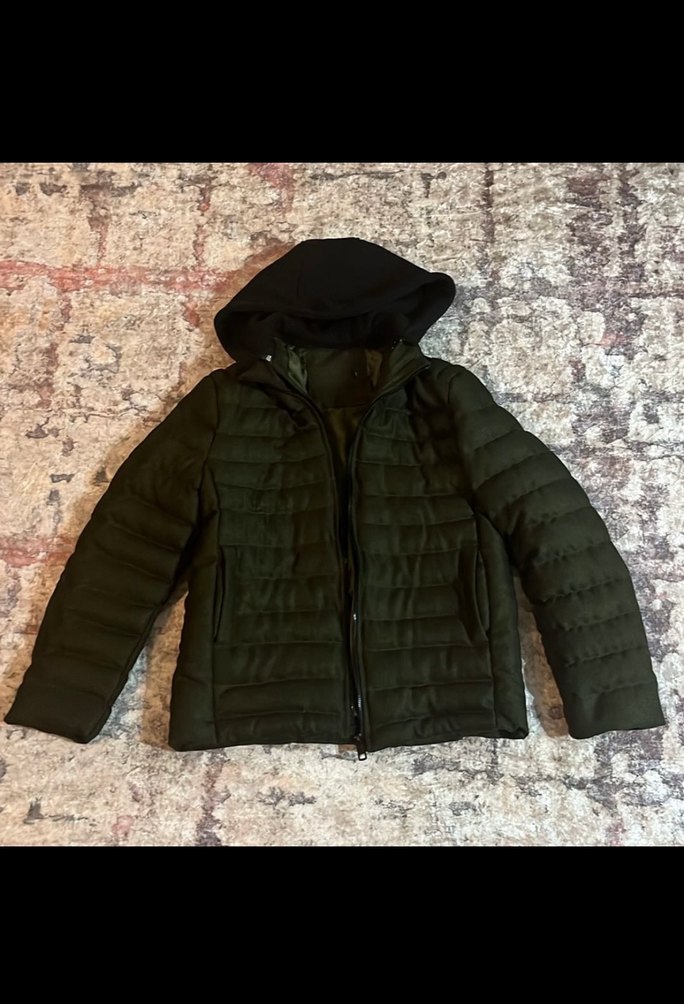 Haki, uzun kollu, kapüşonlu ve şişme erkek kışlık kaban. Yumuşak ve sıcak kumaştan, dış mekan kullanımı için uygun.