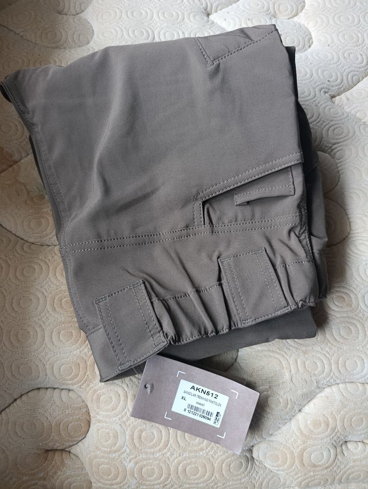 polyester kumaştan yapılmış, haki renkli, kemerli ve normal kesim erkek streetwear pantolon. Günlük dış mekan kullanımı için uygundur. XL haki renk