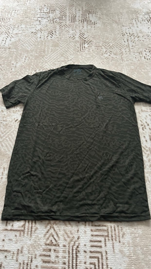 Haki renkli, yuvarlak yaka ve kısa kollu erkek tişörtü, bol kesim ve normal boydadır. Sentetik kumaştan üretilmiş olup, rahat ve şık streetwear tarzındadır.