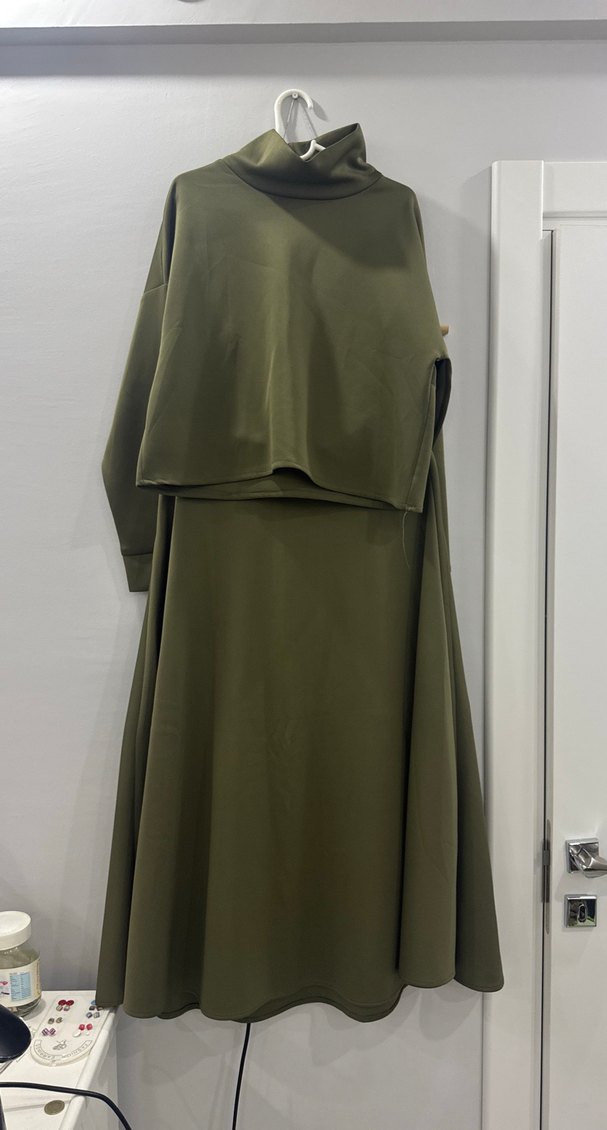 Kadın haki renkte, boğazlı, uzun kollu fermuarlı takım Scuba kumaştan, sade ve minimal tasarımlı günlük kullanıma uygun. Herhangi bir defosu yoktur.