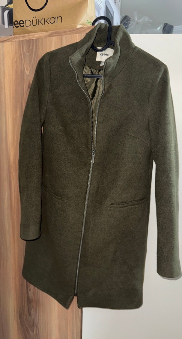 Haki renkte, fermuarlı ve dik yakalı kaban. Yan cepleri ve rahat iç astarı bulunur. SIFIR GİBİ 1 2 DEFA KULLANILMIŞ ÇOK TEMİZ