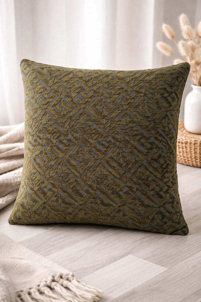Haki ve gri renklerde, modern klasik tarzda geometrik desenli kırlent kılıfı