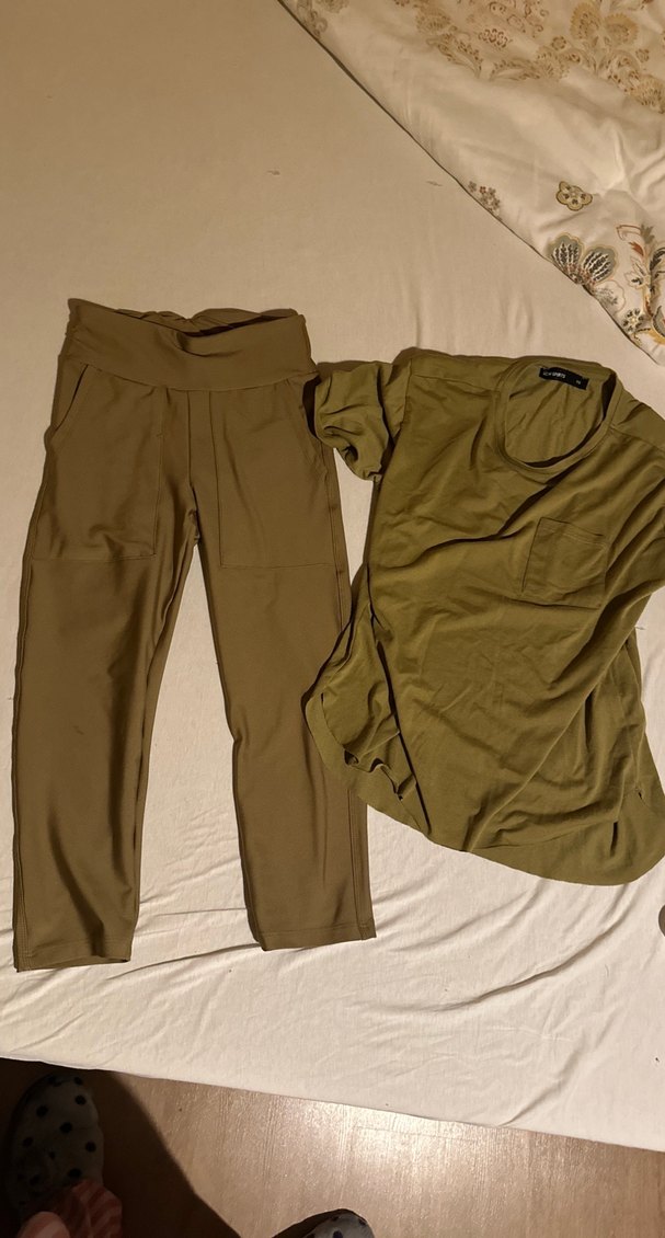 Nefes alabilen keten kumaştan yapılmış, haki renkte, rahat kesim hamile pantolonu. Orta boyda ve günlük kullanım için uygundur.