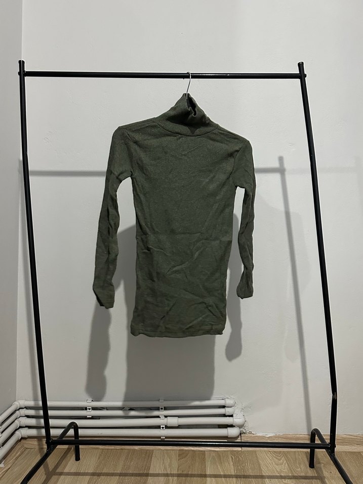 Haki renkte, ince fitilli, boğazlı ve uzun kollu kadın kazak. Yumuşak keten kumaştan üretilmiş, minimalist ve şık bir sokak stili sunar. Günlük kullanıma uygundur. Boğazlı kazak Standart beden Hiç giyilmedi