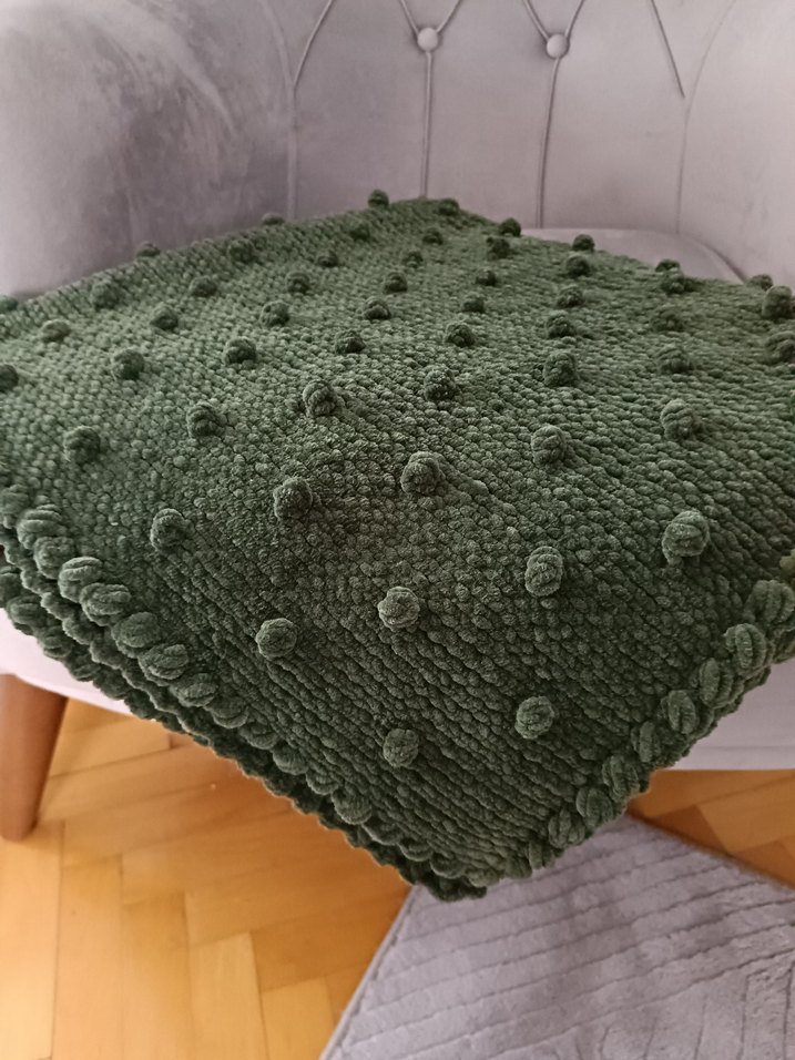 Haki renkte, yumuşak kadife dokulu ponpon detaylı çocuk battaniyesi. 90/90 kare