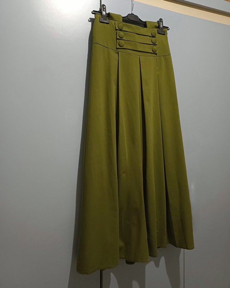 Haki renkli, uzun ve pliseli kadın eteği. İpek gibi dokusu ve bol kesimiyle modern klasik ve bohem bir tarza sahiptir. Ön ve Arka kısmında farkli detayları mevcuttur.