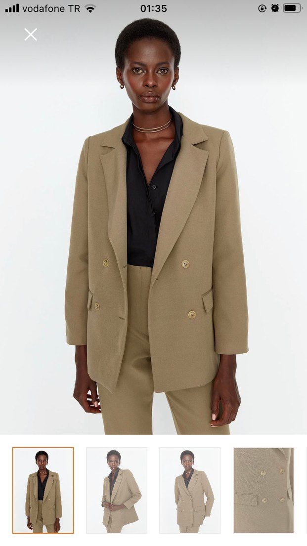 Haki renkli, düğmeli, blazer ceket ofis ve günlük kullanıma uygun sadece bir kere giydim oversize dursun diye büyük beden almıştım ama sonradan yakışmadığını farkettim ilgilenen olursa fiyatta yardımcı olurum