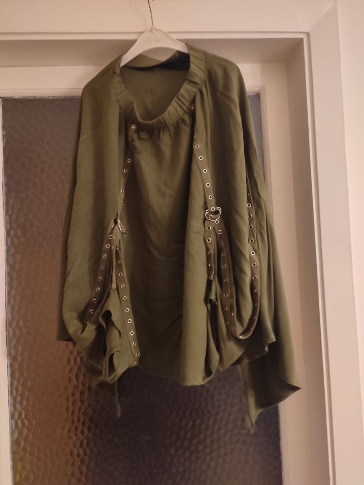 Haki renkli, keten kumaştan yapılmış, salaş kesimli etek. askılı detaylarla avant-garde sokak stili sunar.