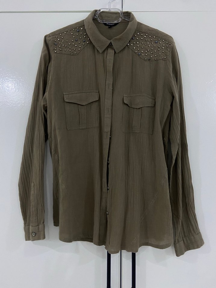 uzun kollu, düğmeli, yakalı omuzlarında metal detaylar bulunan keten gömlek
