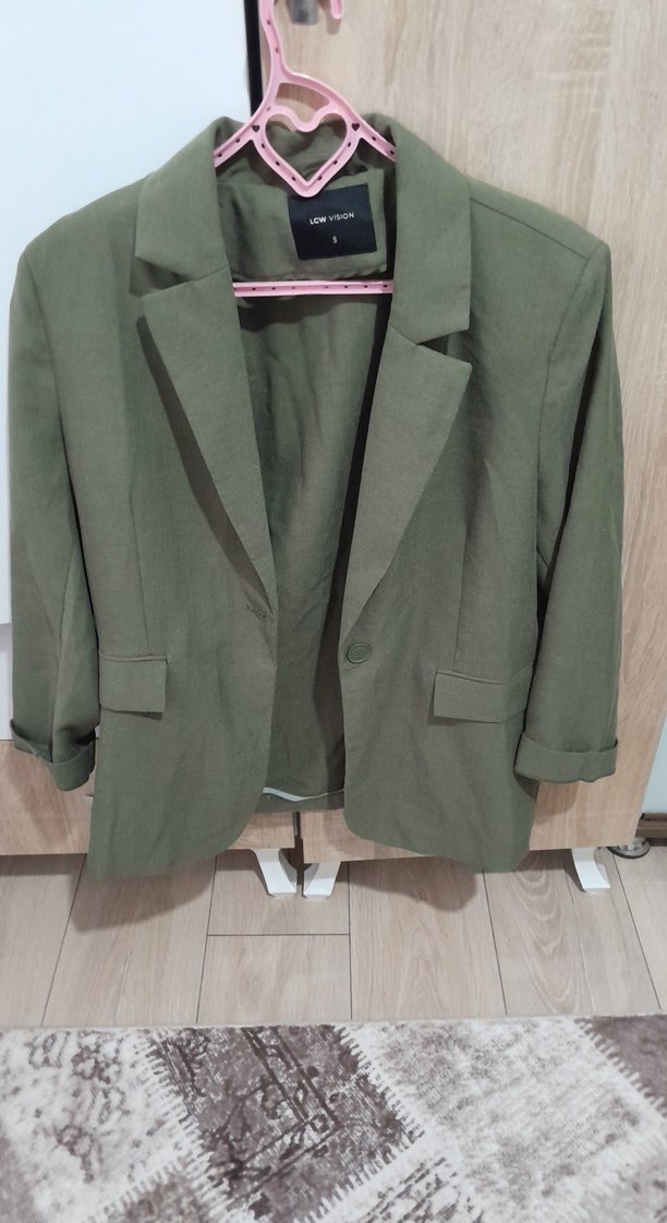 Haki renkli keten kumaştan yapılmış, düğmeli, normal boy midi blazer. Uzun kollu, kesimi rahat, iş ve günlük kullanıma uygun. s beden bol kesim m beden de giyebilir