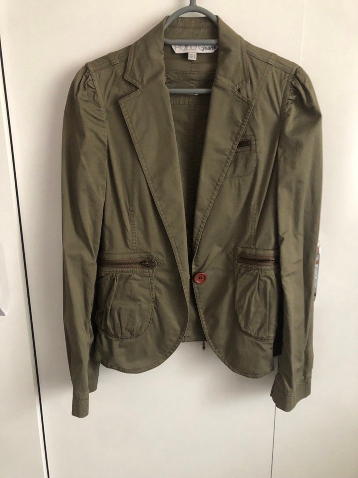 Düğmeli, keten kumaştan yapılmış haki renkli, normal boy ve uzun kollu kadın ceketi. Ofis ve günlük kullanıma uygun, sade ve şık tasarım.