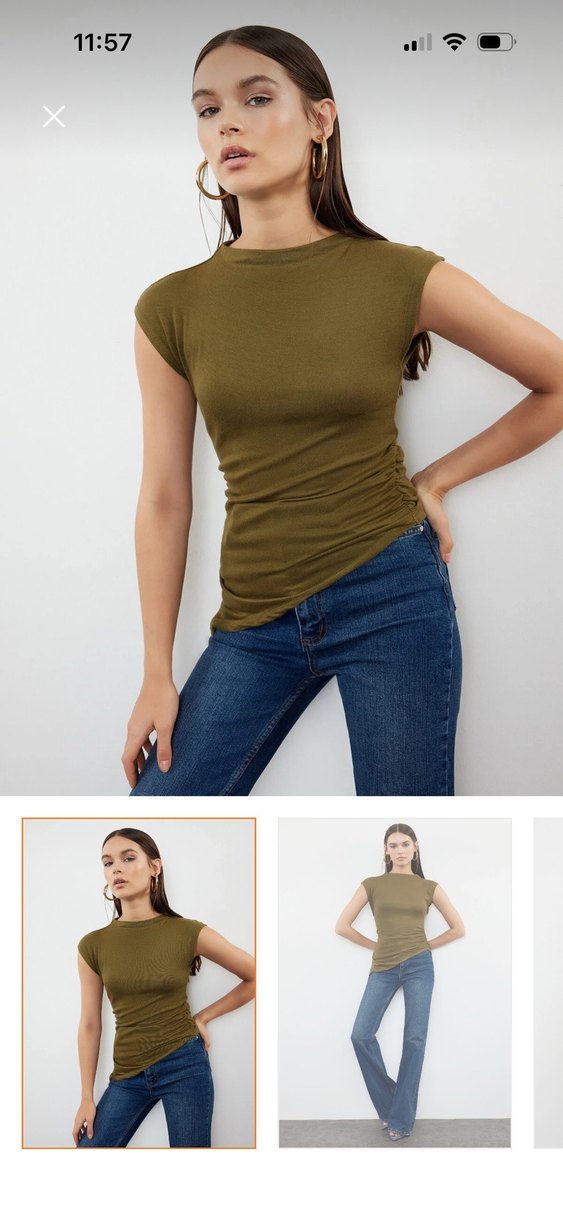 Haki renk, kısa kollu, yuvarlak yakalı, düz denim kumaştan yapılmış, yanları büzgülü ve midi boyda kadın tişörtü. Günlük sokak stili için uygundur.
