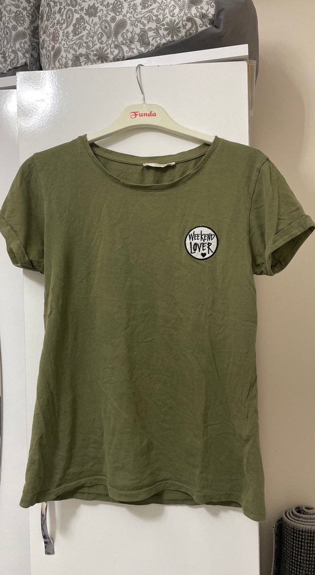 Haki renkli, keten kumaştan, kısa kollu ve yuvarlak yakalı bol kesim tişört. Üzerinde küçük "Weekend Lover" baskısı bulunur. Günlük rahat kullanıma uygundur.